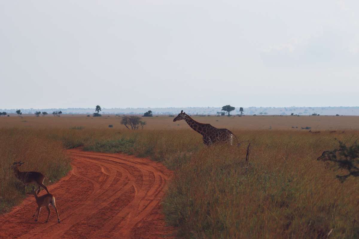 During your Uganda road trip, you’ll usually enter Murchison Falls National Park through the western entrance, the famous West Gate. This route is not only beautiful thanks to the variety of forests, savannah, acacia woodlands, and open plains, but it also requires some time and attention. Because you have to cross the park to reach your lodge, and animals frequently cross the road, especially in the late afternoon, driving calmly is important. This is not only safer but also makes your first moments in Murchison Falls extra special: there’s a good chance you’ll spot elephants, giraffes, or antelope along the way.